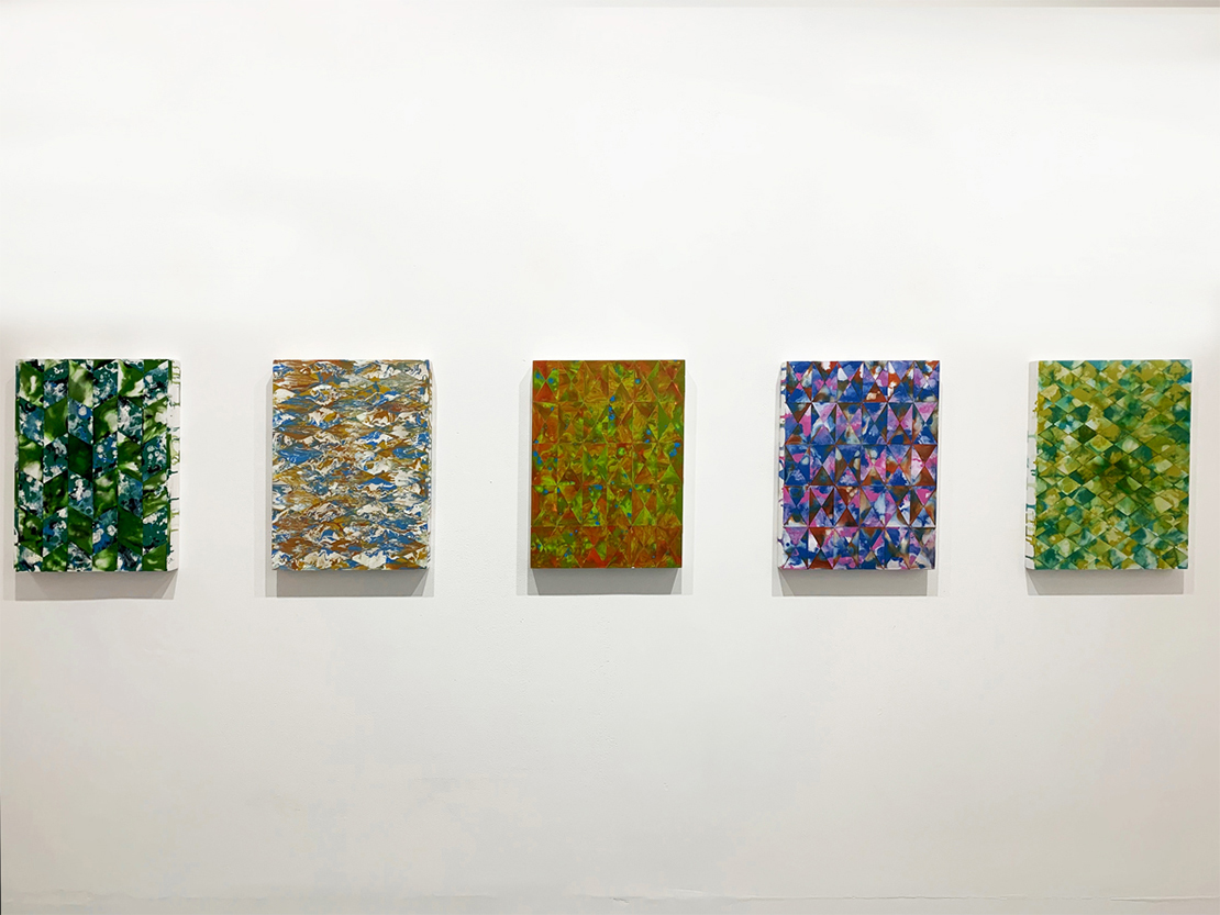 The Kairos Paintings explore the aspect of compressed time by interlacing two individual paintings made on two different occasions. Both painting events appear simultaneously on the same surface and combine snapshots of two distinct moments. They are separated by a geometric system that interrupts and completes them, and together form a new painting. Splicing together two distinct instances results in works that are unpredictable and continue my research into the nature of chance and our understanding of time.
